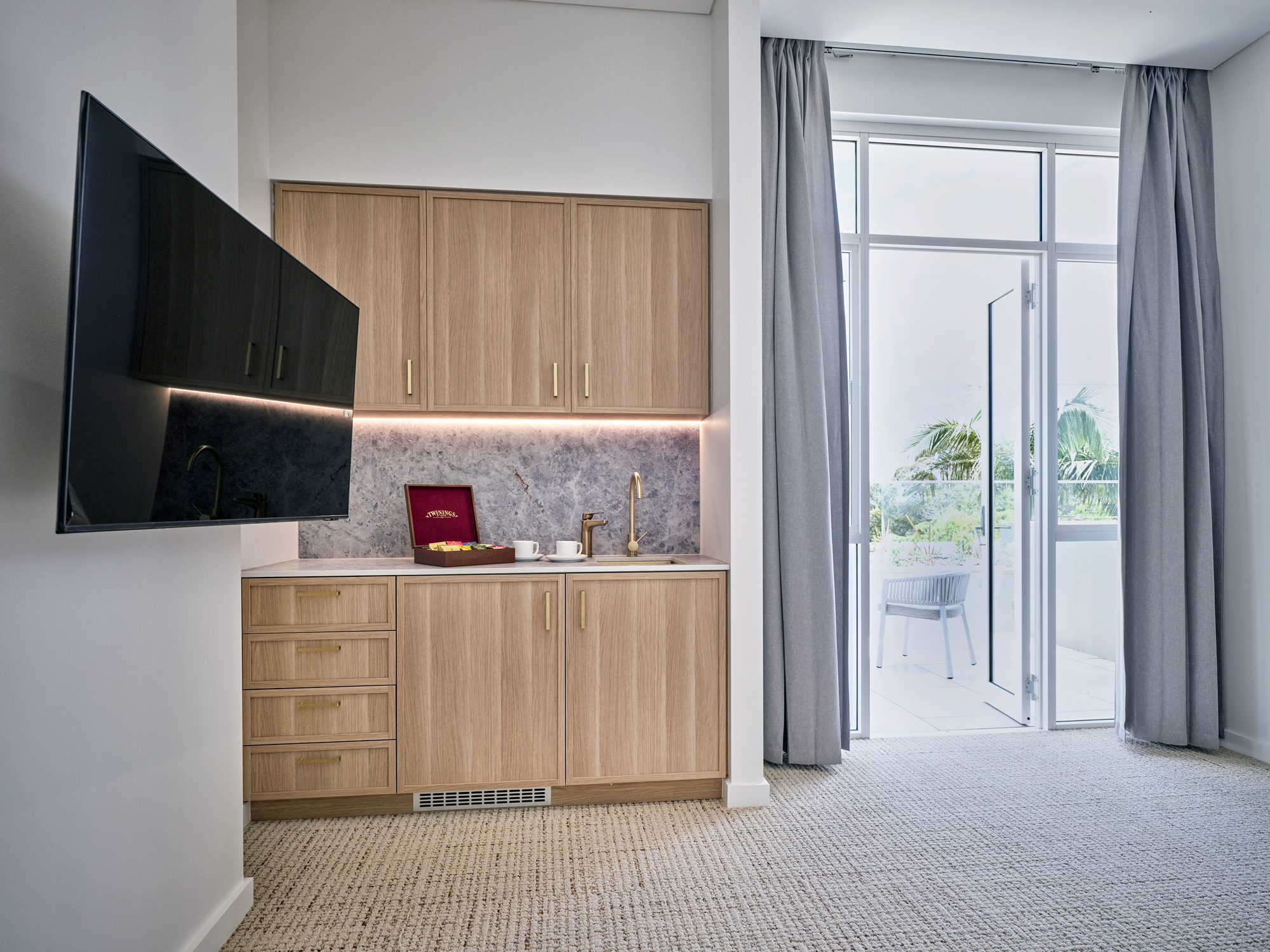 The Superior Suite service area is equipped with an integrated mini-bar fridge, designer sink and an automated hot or chilled water tap, allowing residents to make tea and coffee in the privacy of their room. These Suites have exceptional storage, and ample area for a small dining table to privately entertain guests. Floor-to-ceiling windows with automated, dual curtains, enhance the luxury, comfort, and quality. Other features of the Superior Suite include a wall-mounted smart TV, free Wi-Fi and a personal phone.